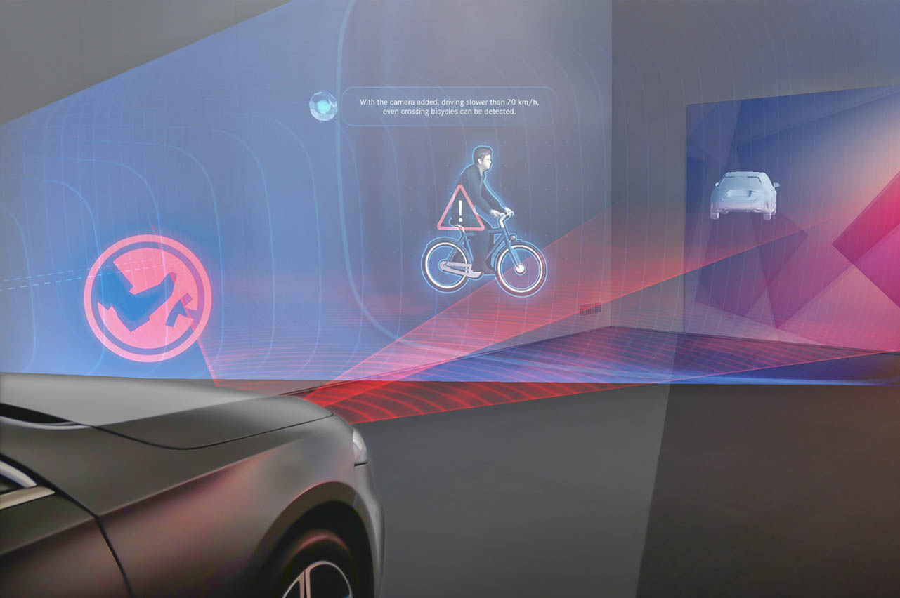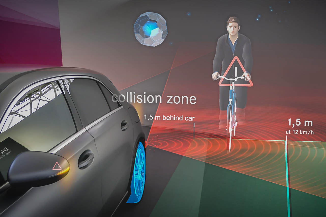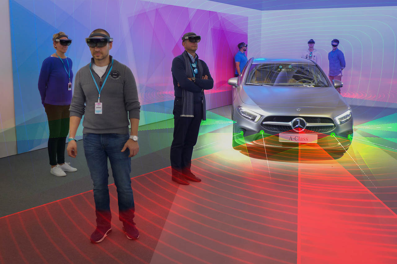 We created a Mixed Reality experience, where you can explore a real car with Microsoft's HoloLens. With these glasses you not only see the car itself, but also get additional information about it. During a 6-minute tour, you can walk around the new A-Class and virtually activate the car's sensors. You see how the car looks around and reacts to what is happening. You also see situations where these sensors are really used, such as when virtual cars and cyclists enter the detection zones and alarms go off in the car at the same time. At the end of the tour, all the sensors are activated, so you can see the huge range of sensors around the car.